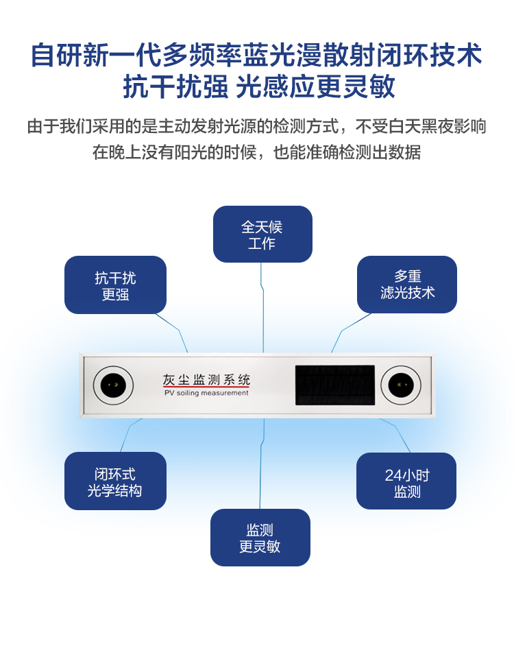 LC-HC1灰塵監(jiān)測系統(tǒng)主要用于太陽能發(fā)電場的光伏陣列中,安裝在光伏板的框架上。該系統(tǒng)能夠實時監(jiān)測電站表面的灰塵積累情況,通過智能化數據分析,為電站清潔維護提供科學依據。適用于各類規(guī)模的光伏電站,無論是大型集中式還是分布式電站,都能有效提升電站發(fā)電效率,降低運維成本,是光伏行業(yè)不可或缺的智能管理工具。