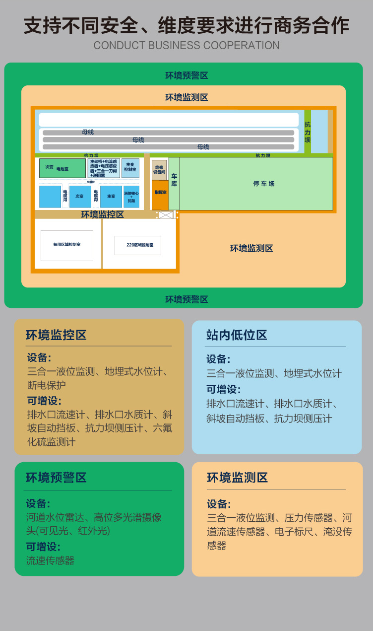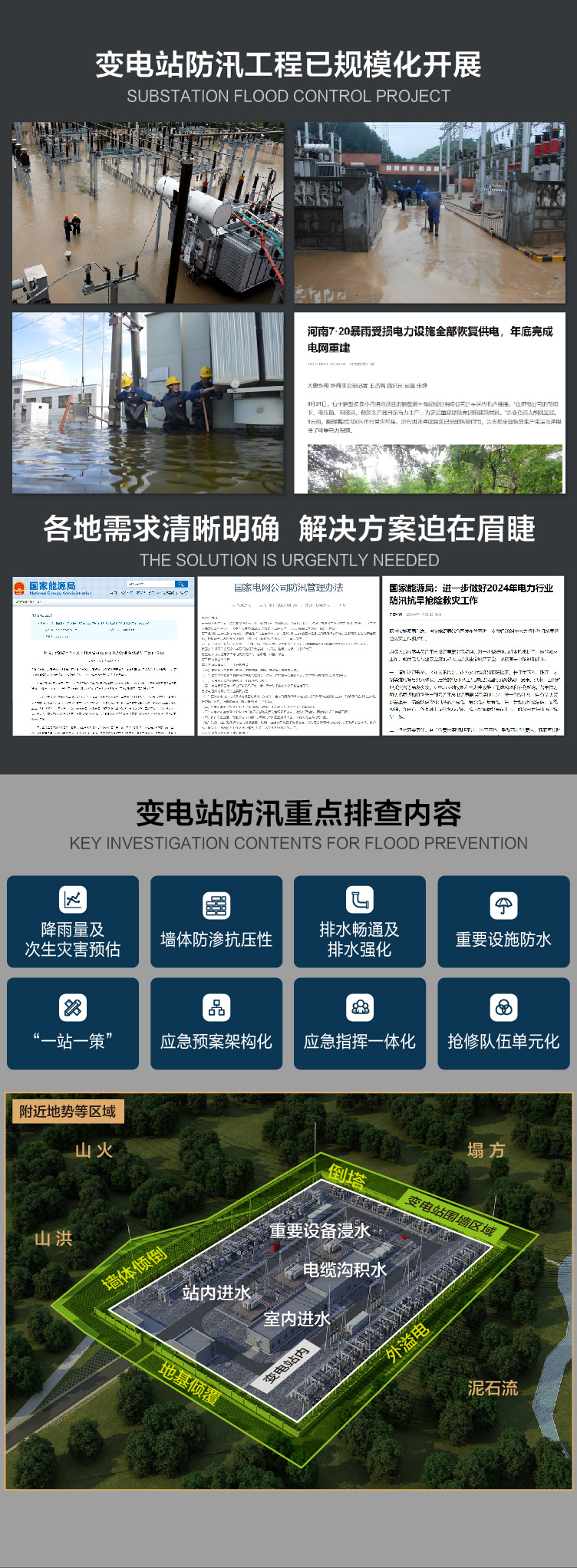 基于“構(gòu)建變電站防汛“四預(yù)”(預(yù)報、預(yù)警、預(yù)演、預(yù)案)體系”的提升耐汛能力要求,我們針對變電站存在特點、結(jié)合無人值守變電站狀態(tài)、不同級別變電站策略要求特提供以下策略針對無人值守 變電站、市重點變電站省重要節(jié)點(國級)變電站提供一體化抗洪抗?jié)辰鉀Q方案。