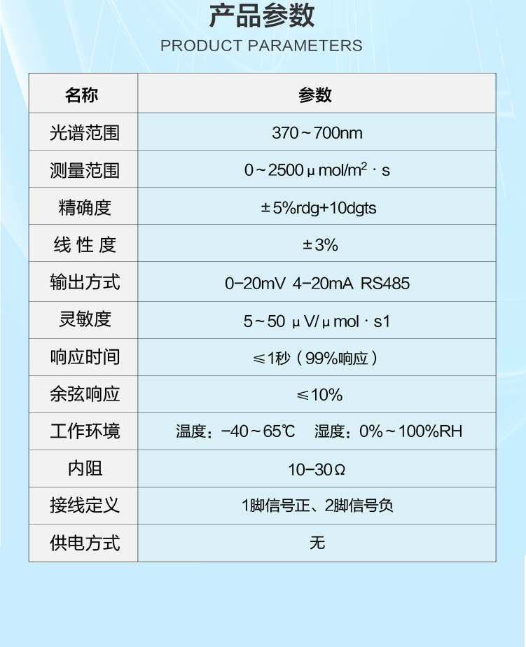 TBQ-5L光合有效傳感器,一款專為植物生長與光合作用研究打造的高科技產(chǎn)品。它精準測量并顯示不同光譜波段對植物光合作用的貢獻,幫助研究人員和園藝愛好者深入了解植物對光照的響應。產(chǎn)品特點顯著,擁有高精度光譜分析儀和實時數(shù)據(jù)記錄系統(tǒng),能夠迅速捕捉并解析光照變化對植物生長的影響。適用范圍廣泛,無論是科研機構(gòu)的植物生理研究,還是溫室大棚的精準光照管理,光合有效表都能提供有力支持,助力實現(xiàn)更高效、更科學的植物生長調(diào)控。