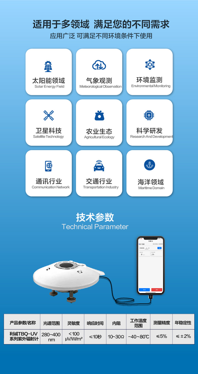 手持紫外輻射計是一款便攜式高精度測量設(shè)備,專為快速檢測并量化紫外線(UV)輻射強度而設(shè)計。它廣泛應(yīng)用于環(huán)境監(jiān)測、紫外線消毒效果評估、戶外工作者健康保護、科研實驗以及皮膚保護產(chǎn)品測試等多個領(lǐng)域。通過直觀的數(shù)字顯示,用戶可輕松掌握紫外線強度,有效預(yù)防紫外線過量帶來的危害,確保工作與生活環(huán)境的安全與健康。