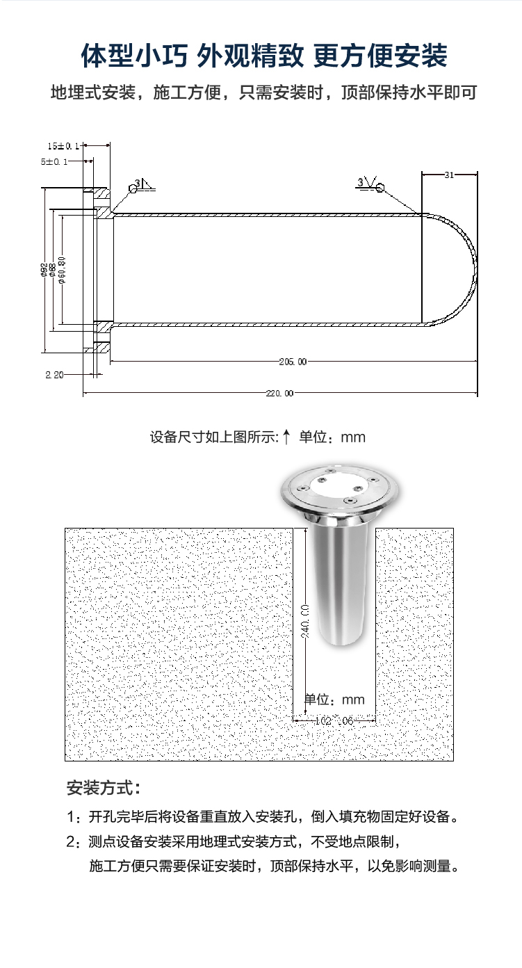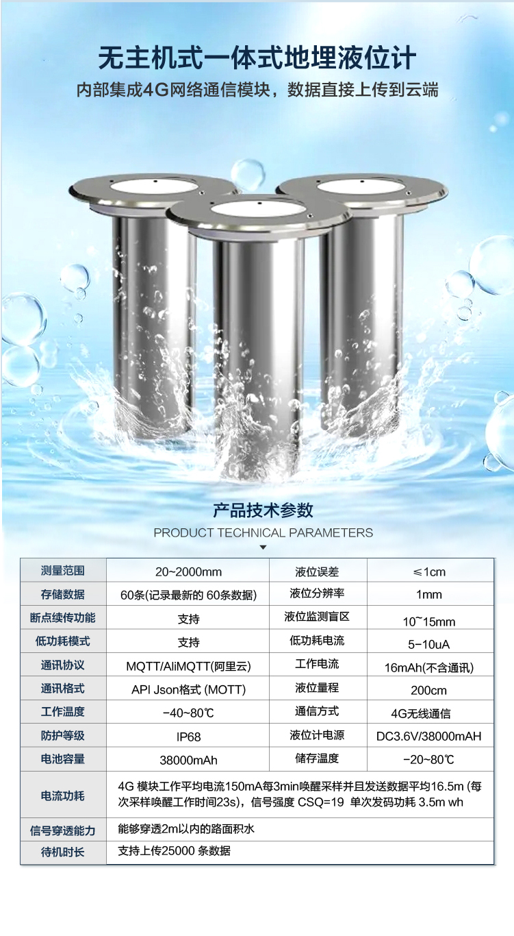 DC-JS3型一體式地埋液位計主要應用于城市內澇路面積水檢測領域,可實時監(jiān)測低洼路段的積水情況,保障城市建設的系統(tǒng)性和完整性。此產(chǎn)品無主機、內部集成4G通訊模塊,可靠性高、功耗低、可擴展性好、實用性強,為城市防汛提供堅實的技術保證,有效幫助管理者了解實時積水實況,為城市防災減災指揮調度決策提供數(shù)據(jù)支持,為公眾出行提供方便,避免公眾生命財產(chǎn)遭受損失。