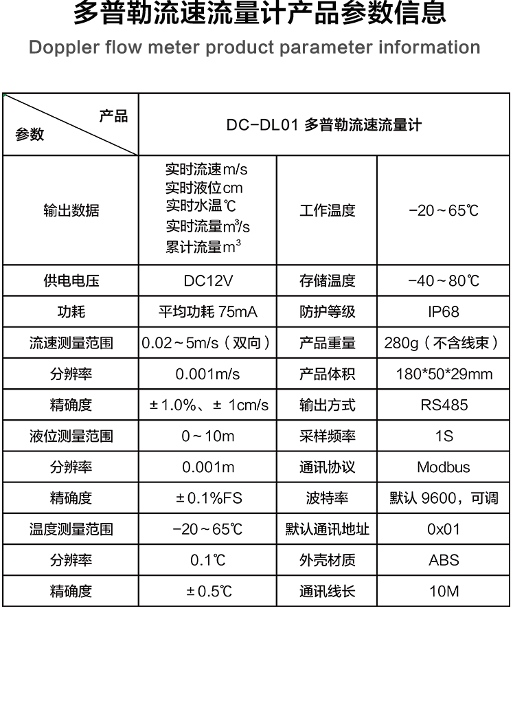 LC-DL01多普勒流速流量計是一款基于超聲波多普勒原理設計的高精度測流設備。它通過內(nèi)部集成的信號處理器和專有流速計算算法,能夠快速準確地測量水體流速,無需校準且測量無漂移。該設備不僅集成了水溫傳感器和壓力傳感器,還能同時采集輸出水位數(shù)據(jù),實現(xiàn)水位、流速、水溫的一體監(jiān)測.廣泛應用于灌區(qū)渠道、自然河道、城市排水管網(wǎng)、工廠計量、泵站等各種場合,為流量監(jiān)測和管理提供可靠的技術支持。