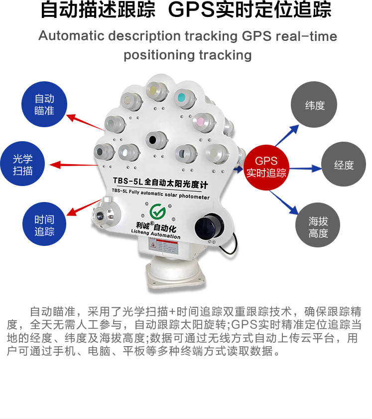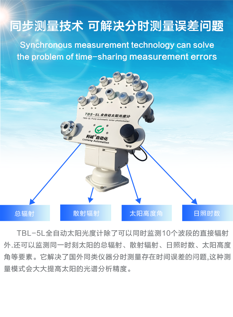 TBS-5L全自動(dòng)太陽(yáng)光度計(jì)為高精度野外太陽(yáng)、天空輻射測(cè)量?jī)x器,用于測(cè)量太陽(yáng)和天空在可見(jiàn)光和近紅外的不同波段、不同方向、不同時(shí)間的輻射亮度,來(lái)推算大氣氣溶膠、水汽、臭氧等成分的特性;用于大氣環(huán)境監(jiān)測(cè),衛(wèi)星校正等應(yīng)用。具有自動(dòng)瞄準(zhǔn),太陽(yáng)能供電,具有易攜帶安裝,可自動(dòng)傳輸數(shù)據(jù)等特點(diǎn);它是當(dāng)今應(yīng)用廣、功能全、權(quán)威性高的太陽(yáng)光度計(jì)儀器。